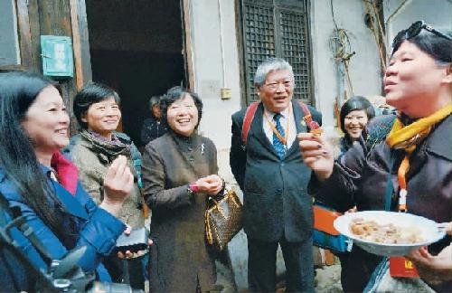 4月20日下午,台北夏氏宗亲会、台北绍兴同乡会的20多位台湾同胞来到越城区书圣社区,参加绍台“两岸邻里节”活动。台胞们走进老台门,受到社区居民热情欢迎。大家拉家常、品小吃,增进了友情和乡情。台胞们还参观了蔡元培故居,戒珠寺、王羲之陈列馆等。 (记者 袁云 摄)