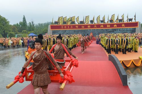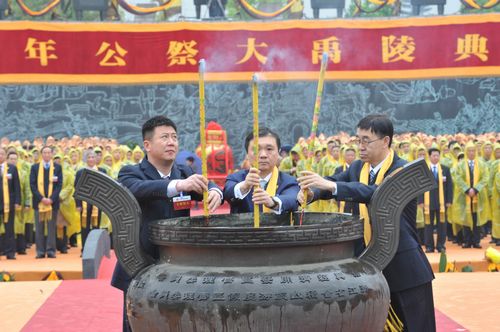 庄严肃穆的祭禹祀典始于公元前2059年左右,开端于大禹之子夏王启。自秦以后,历代都有帝王或他们派遣的大臣到绍兴祭禹。1995年4月20日是新中国成立后首次公祭大禹陵。2006年,大禹祭典被国务院列入国家级非物质文化遗产保护名录。2007年,公祭大禹陵典礼成为“国家级”的祭祀典礼。如今,绍兴的公祭大禹陵典礼已具有全国性影响,形成了“北有黄陵、南有禹陵”的中华民族祭祀先祖的格局。(记者冯益华)
