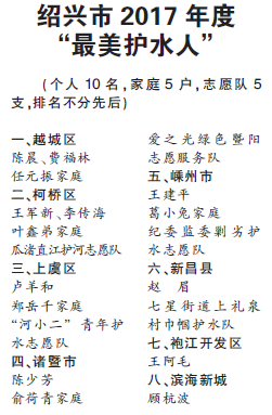 有各级河湖长以身作则、率先垂范,越来越多的群众加入了管河护水的队伍,成了“民间河长”与护水人。在这次评选出的“最美护水人”中,既有绍兴海通印染有限公司董事长李传海这样“从被整治者变身治水人”的企业河长,也有上虞“河小二”这样放弃休息天、结伴投身到治水剿劣中的青年护水志愿者队伍,更有越城区燕甸园社区居民任元振不顾外界眼光,带领家人“从自己做起、从身边做起”参与义务劝导的热心护水人……“治水对每一个人都有好处,作为市民应该响应政府的号召,人人参与进来。”任元振老人说。