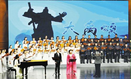 昨晚,“治水之美”颁奖晚会暨《大禹颂》文艺演出在绍兴大剧院举行。晚会表彰了“最美河湖”、“最美小微水体”、“最美护水人”、“最美河(湖)长”等,展示了我市2017年的治水成果。大型原创组歌《大禹颂》首演,艺术地再现了大禹治水的经典故事。图为《大禹颂》演出现场。 首席记者 袁 云 摄 见习记者 周梦琪 文