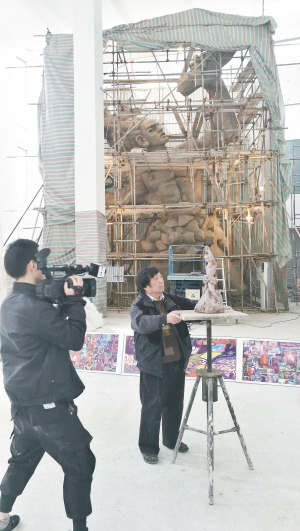 楼家本正在创作《盘古开天》大型壁画的盘古模型