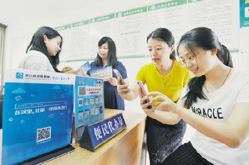昨日,诸暨市陶朱街道西湖村“最多跑一次”代办处,代办员正在指导村民运用“掌上办事”系统快捷方便办理有关事项。陶朱街道今年公开招考25名本地大学生担任村(社区)代办员,为村民代办该市48项“一证通办”村级延伸业务和街道12项民生业务。近期新建的“掌上办事”系统,更使代办员工作效率有了进一步提高。 通讯员 徐德文 刘瑞安 摄